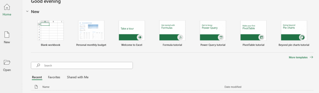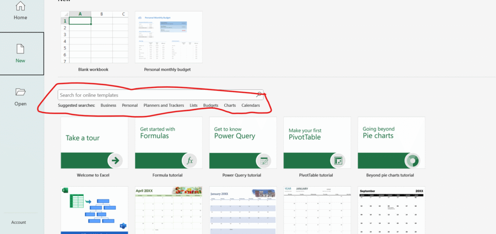 Open excel file from window menu-> More templates