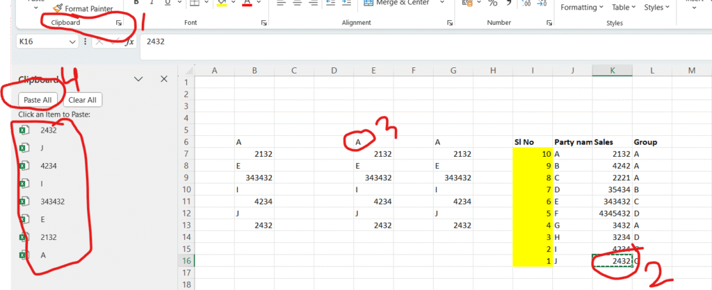 Click clipboard option> select your text > copy > copy > copy Then select your paste area then paste all.