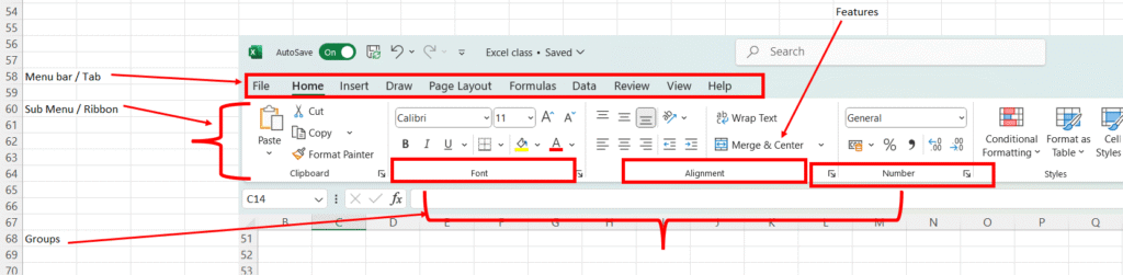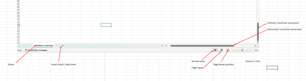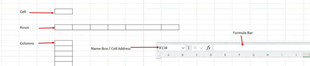 Cell, Rows, Column, Name box & formula bar:
